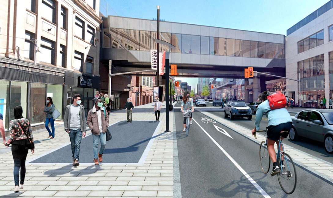 The renewed Rideau corridor includes improved infrastructure, more pedestrian space around the O-Train’s Rideau Station and two new ParaTranspo stops. It also includes new bike lanes and rack-style parking.